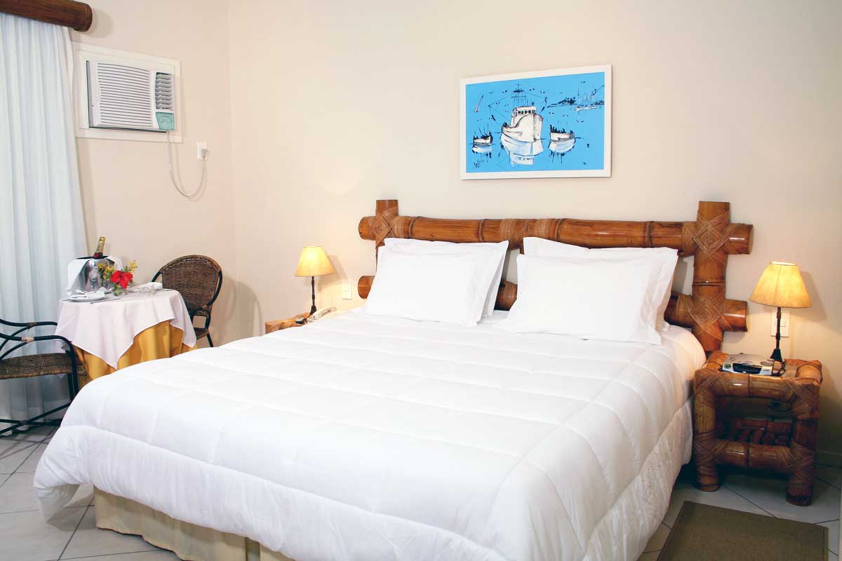 Apartamentos com varanda vista para a Praia de João Fernandes. Equipados com Tv LCD 32" com canais a cabo, cama king-size, cofre digital, fechadura eletrônica, frigobar, secador de cabelo e rádio relógio.